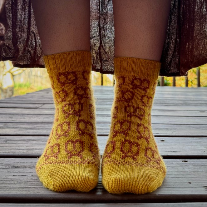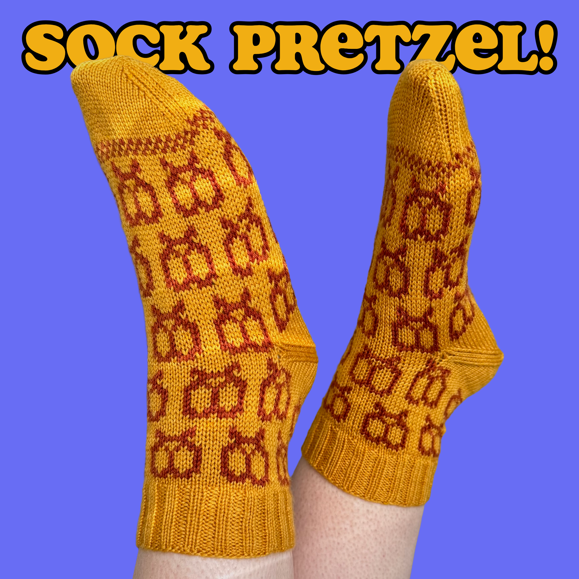 I am pleased to add Sock Pretzel! to my repertoire of food-themed colorwork sock patterns. Starting today, they’re available for purchase on Ravelry!